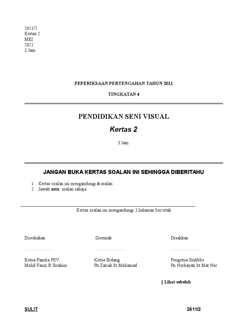 Soalan PSV Kertas 2 Percubaan SPM 2011 Negeri Perak. Soalan Pertengahan Tahun Pendidikan Seni Visual Tingkatan 4 adalah antara bahan-bahan terbaik yang kami adaBahan yang terdapat di sini memenuhi keperluan Pentaksiran Berasaskan Sekolah yang dilaksanakan secara menyeluruh mengikut prinsip bahawa semua mata pelajaran yang terkandung dalam KSSM memainkan peranan yang penting bagi memenuhi keperluan. Soalan Spm 2019 Bahasa Arab.